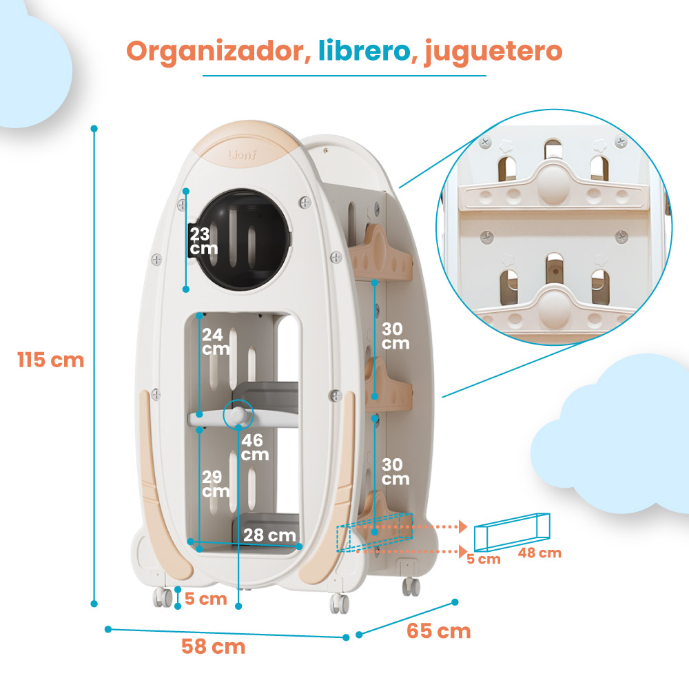 Una de las características más destacadas de este organizador es que cuenta con rueditas en la base. Esto permite que los niños puedan moverlo fácilmente por la habitación.