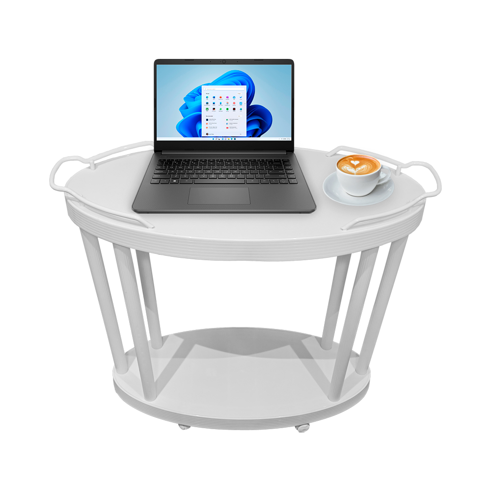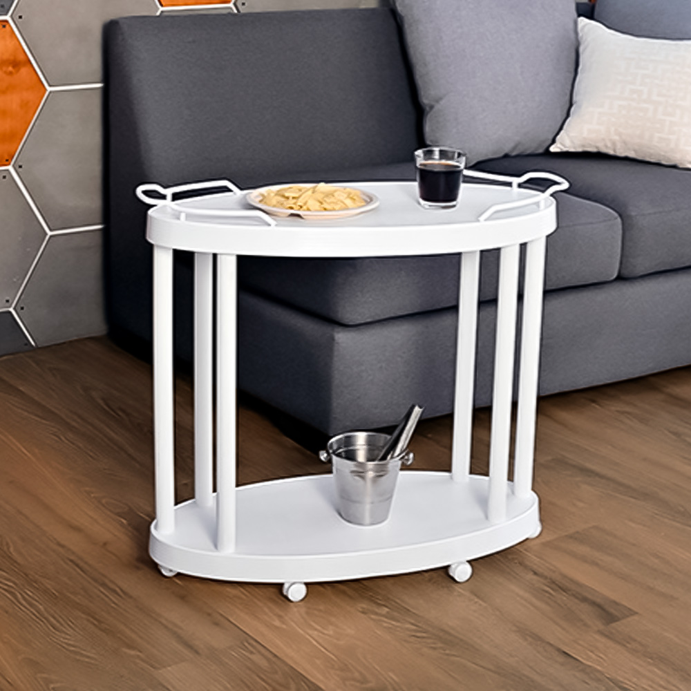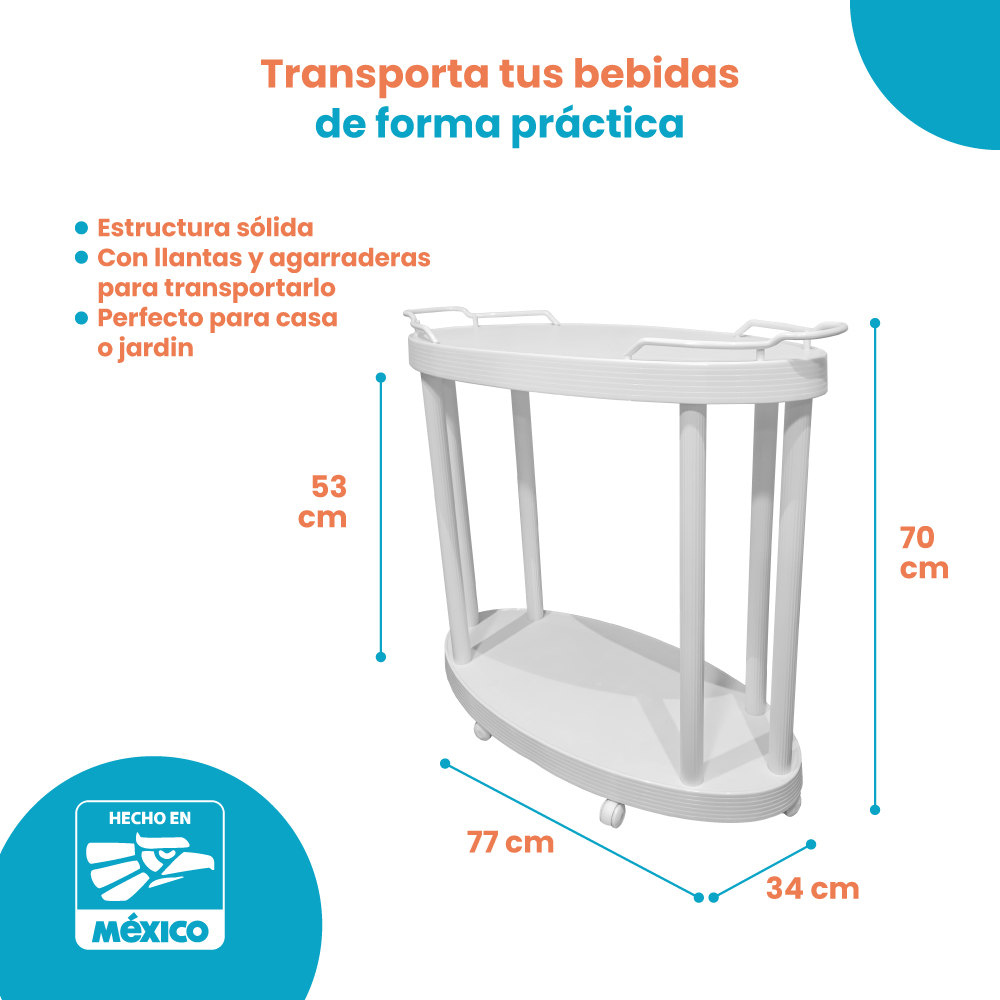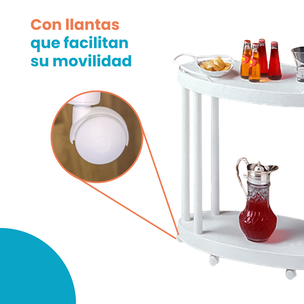 Carrito ovalado multiusos, cuenta con 2 repisas para llevar objetos de un lado a otro, con sus llantas, su movilidad es óptima y facilita su movimiento. Ideal para alimentos o decoración.