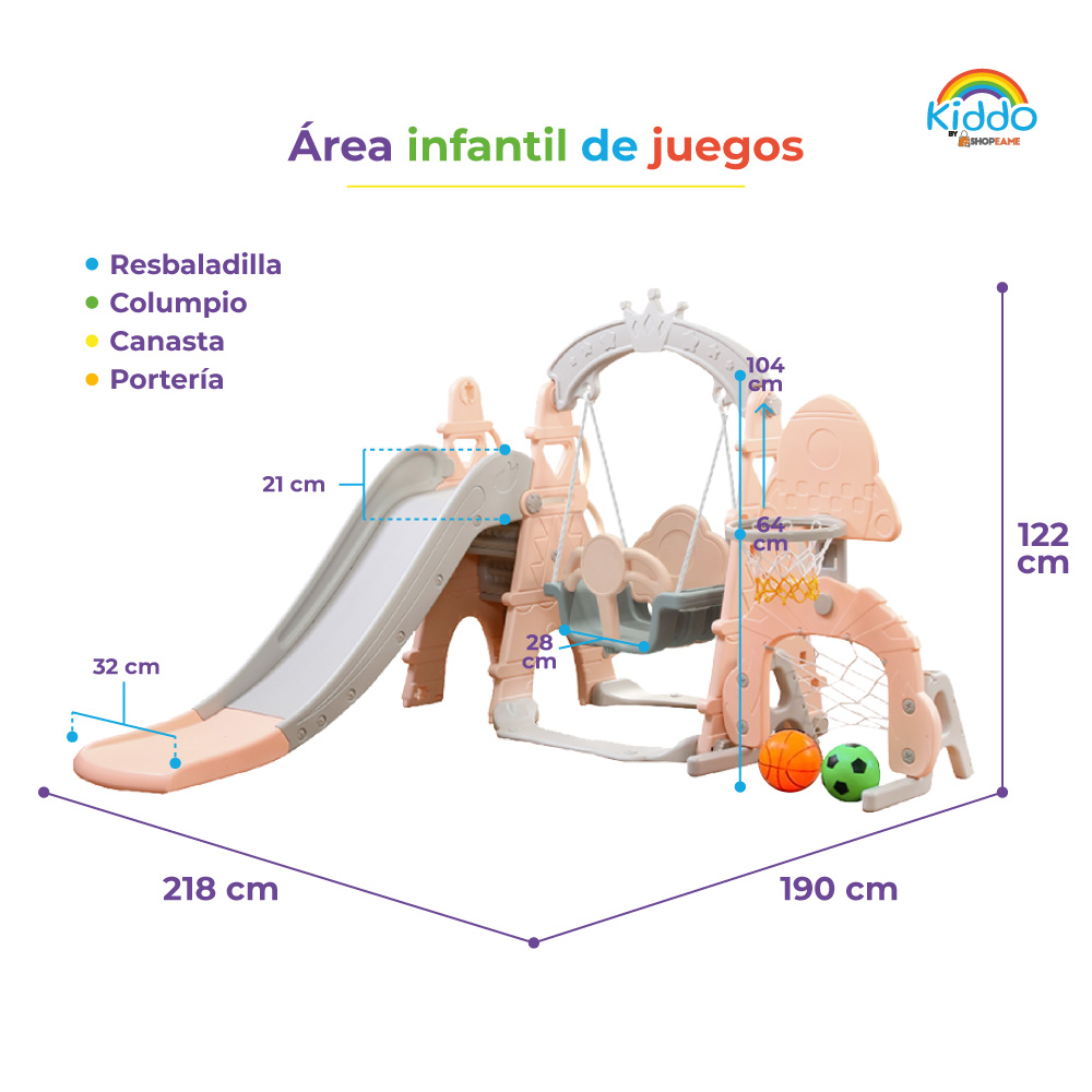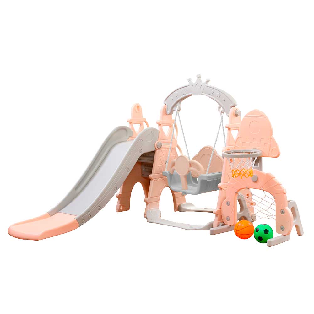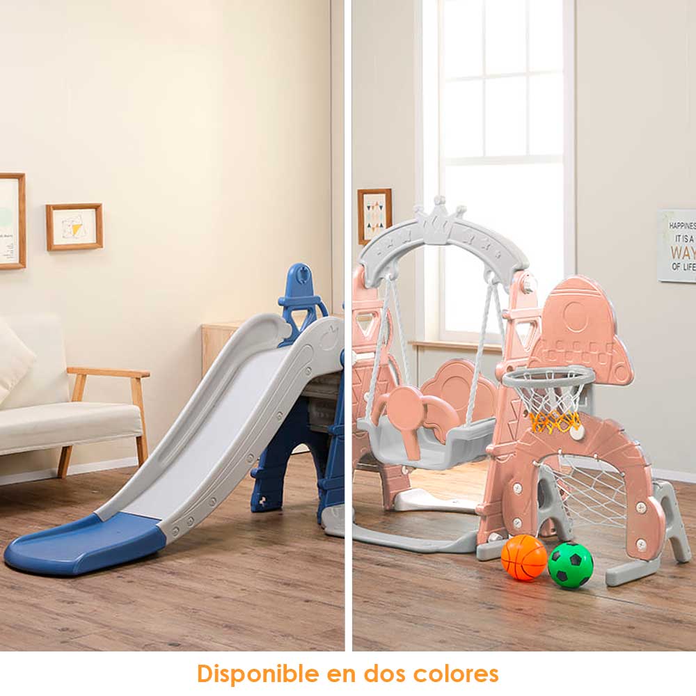 El set 3 en 1 incluye una resbaladilla, un columpio y una canasta para basquetbol.
